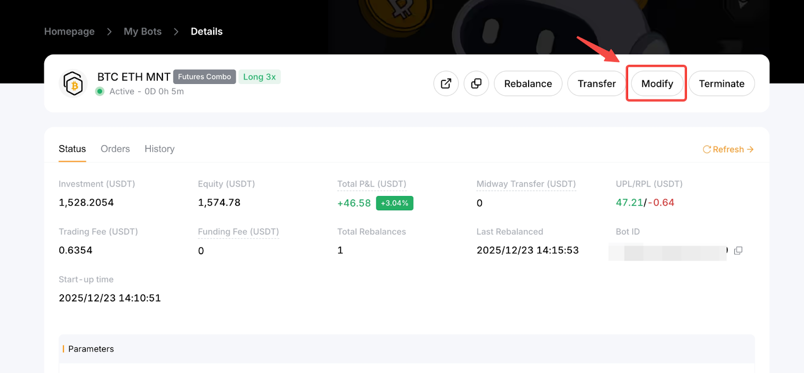 Yes. You can adjust the parameters of your running Futures Combo Bot via the Bot Details page. To start, go to View My Bots and find an active bot whose parameters you wish to adjust. Then click on Details Modify.