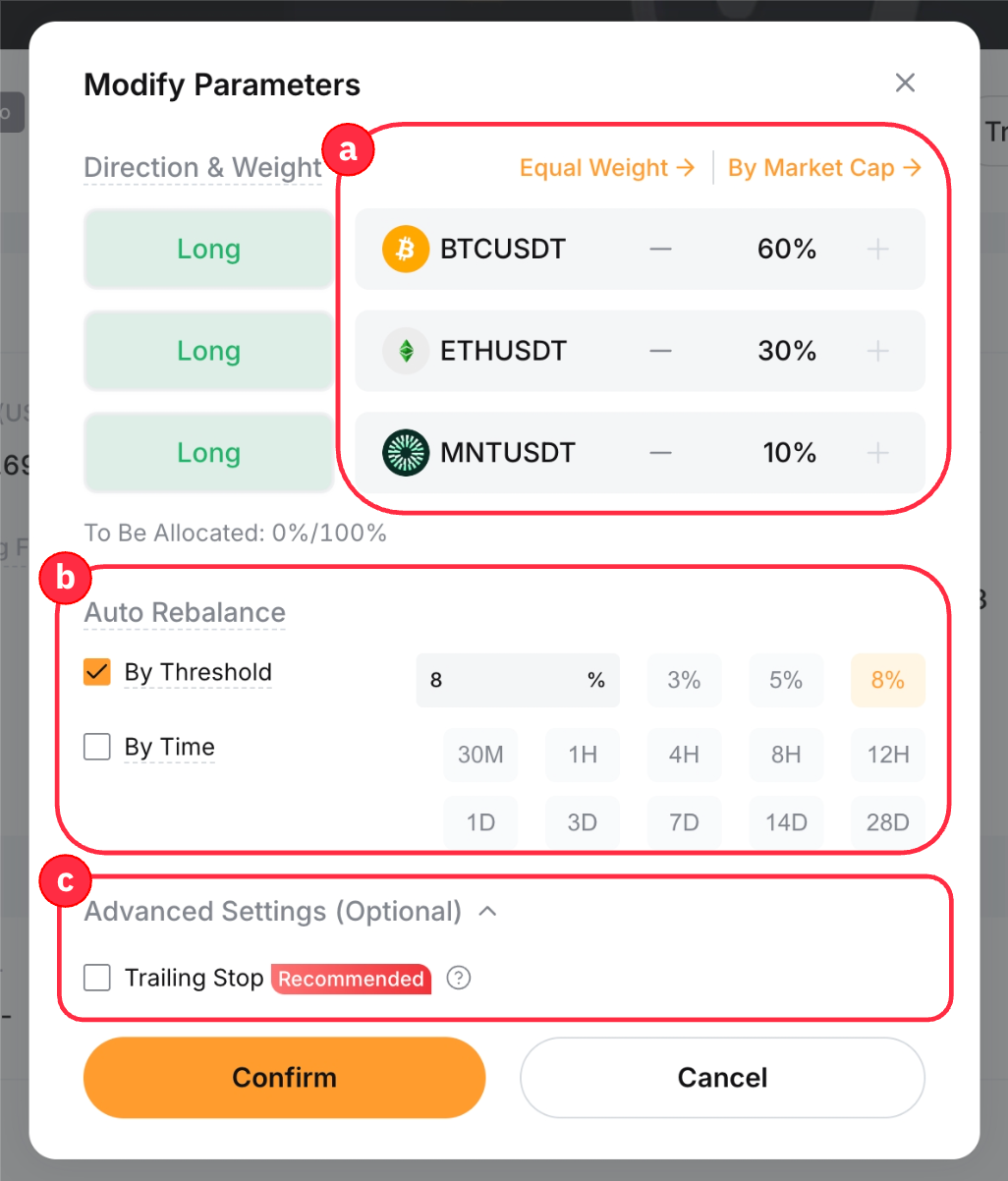 1. Set the proportion of your selected contracts either manually or by choosing the available preset options— by equal weight or by market cap.