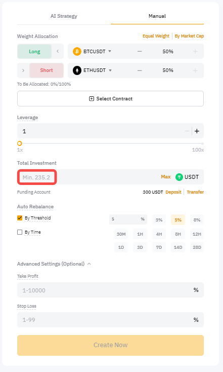 When one of the contracts triggers a rebalance condition, the system will automatically rebalance the portfolio. For instance, if BTCUSDT hits 40% or falls below 20%, the system will trigger a rebalancing, reverting the allocation to BTCUSDT at 30% and ETHUSDT at 70%.