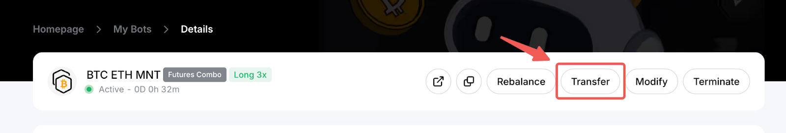 Yes, you can add or withdraw funds from your active Futures Combo bot by clicking on the Transfer button on the Bot Details page. Simply switch to the appropriate tab and set the amount details via the input field or the percentage bar before clicking on Confirm.