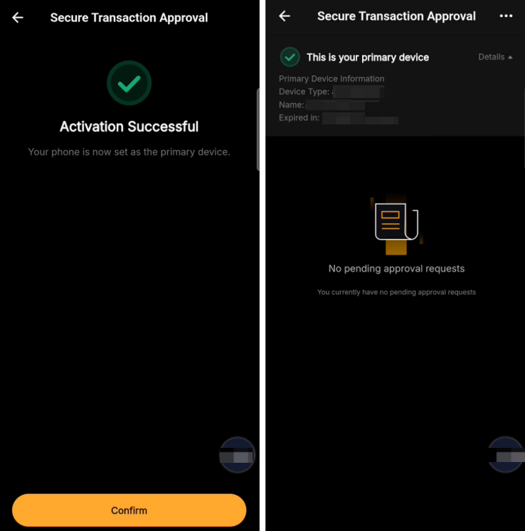 — In rare cases where you don't receive a notification on your primary device, go to Security → Secure Transaction Approval to check for any pending requests.