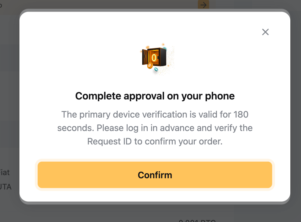 Step 1: After setting your primary device, you'll see a Primary Device Verification or Complete approval on your phone message when you try to initiate a transaction from a secondary device or the Bybit website.