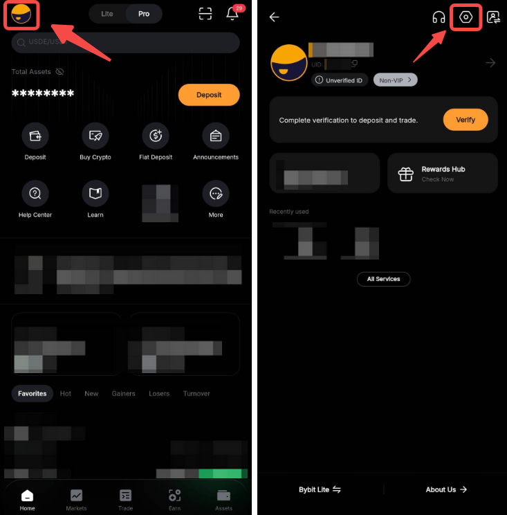 Step 1: Log in to the Bybit App with your Main Account, tap your profile icon in the top left corner, then tap the settings icon in the top right to access the Settings page.