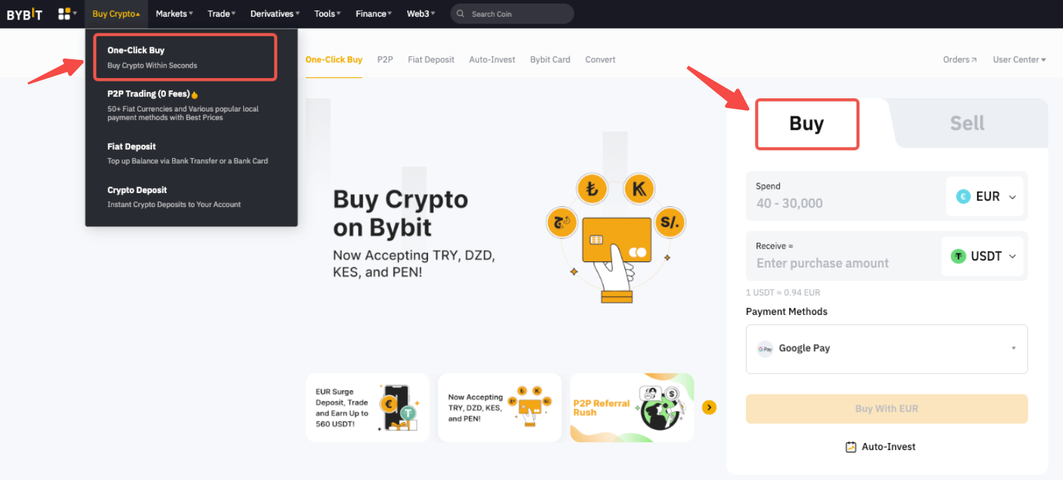 Step 1: Click on Buy Crypto → One-Click Buy at the top left corner of the navigation bar to enter the Buy function page.