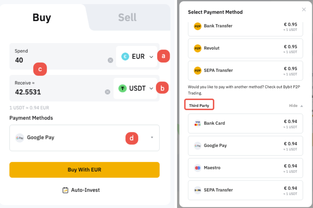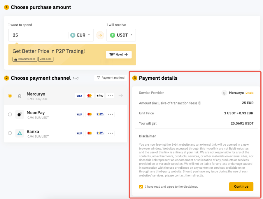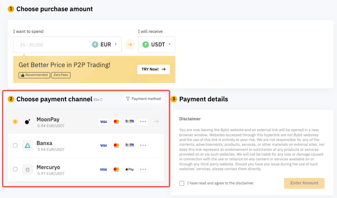 Before we learn more about Buy Crypto One-Click Buy with Third Party Channel, please note that Bybit does not handle fiat deposits directly, and this service is wholly handled by third-party payment providers.