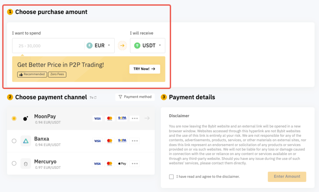 Step 3: In section 1, select the fiat currency you want to pay and the coin you would like to receive in your Bybit account. The purchase limit will be indicated in the amount input box and varies according to the provider.