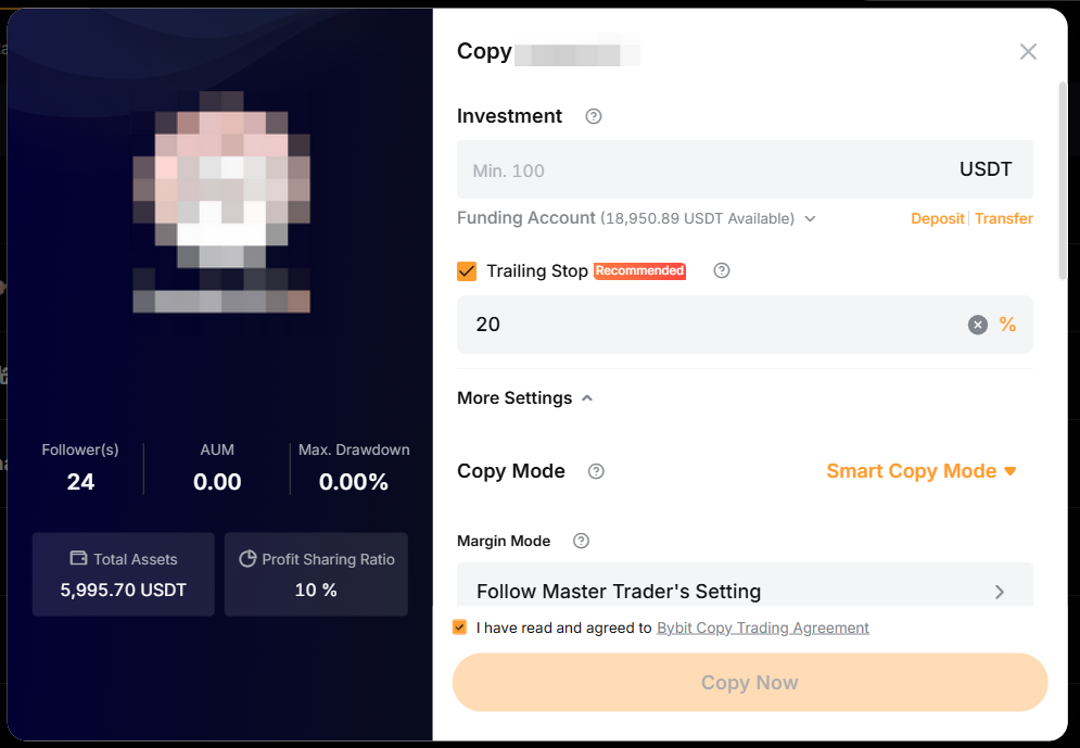 — Generally, the minimum investment amount for Copy Trading Classic is 100 USDT. However, your Master Trader may set a higher minimum required investment amount. Hence, you will not be able to reduce your investment to lower than 100 USDT or the amount required by your Master Trader.