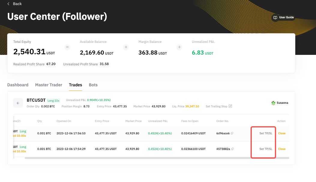 To set a TP/SL for your USDT Perpetual orders, go to User Center (Follower) → Trades → Open Position → Details. Click on Set TP/SL and you can enter your desired Take Profit or Stop Loss price. You can also select the reference price to trigger your TP/SL.