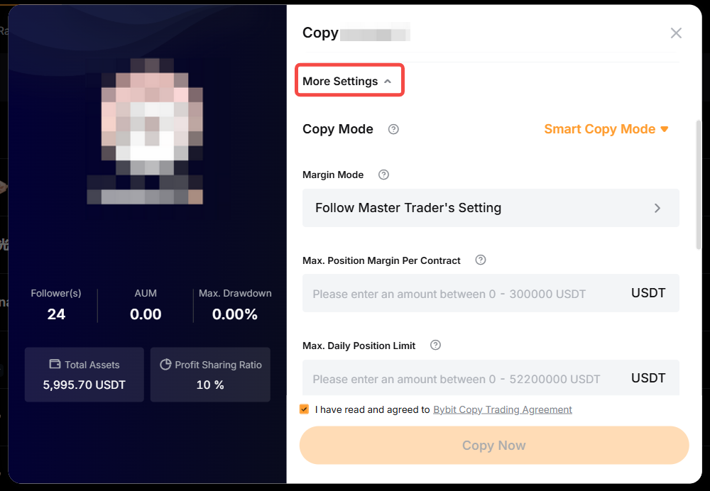 Step 4: Click on More Settings to configure additional trade settings for copying.