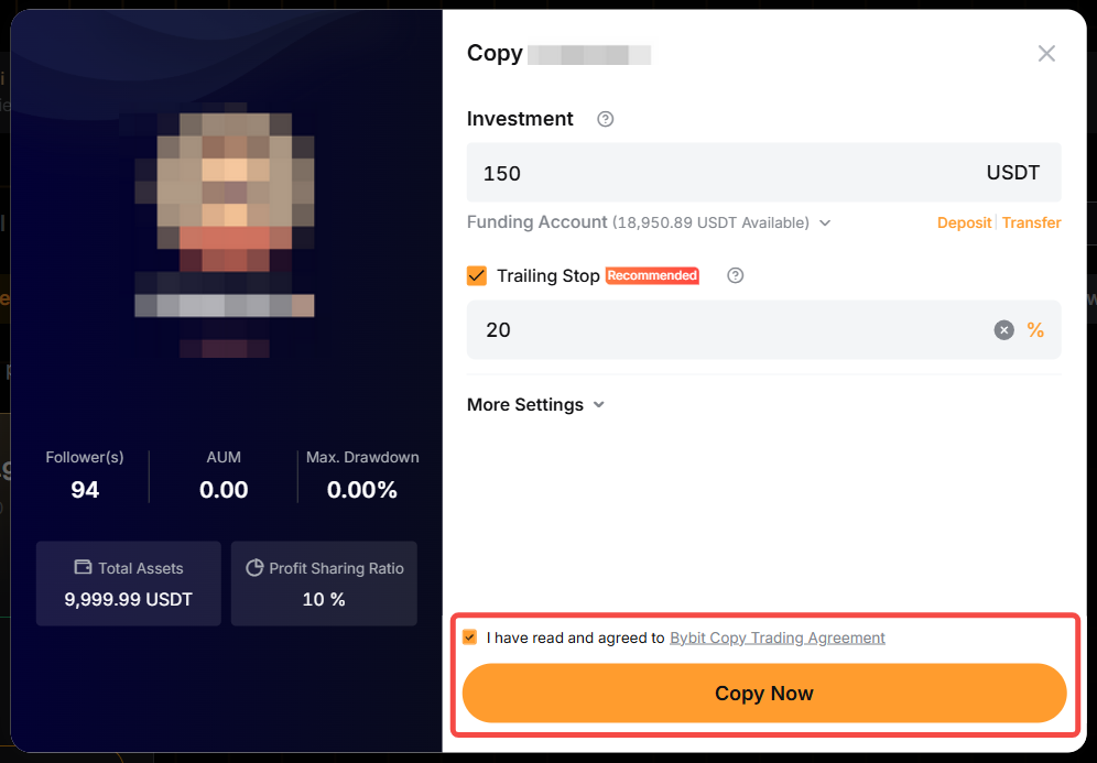 Step 3: Create your Copy Trades by setting your Investment Amount. The minimum investment amount is 100 USDT. Please note that your Master Trader can set a higher minimum investment amount required for copying, and you will be able to see the amount stated in the column.