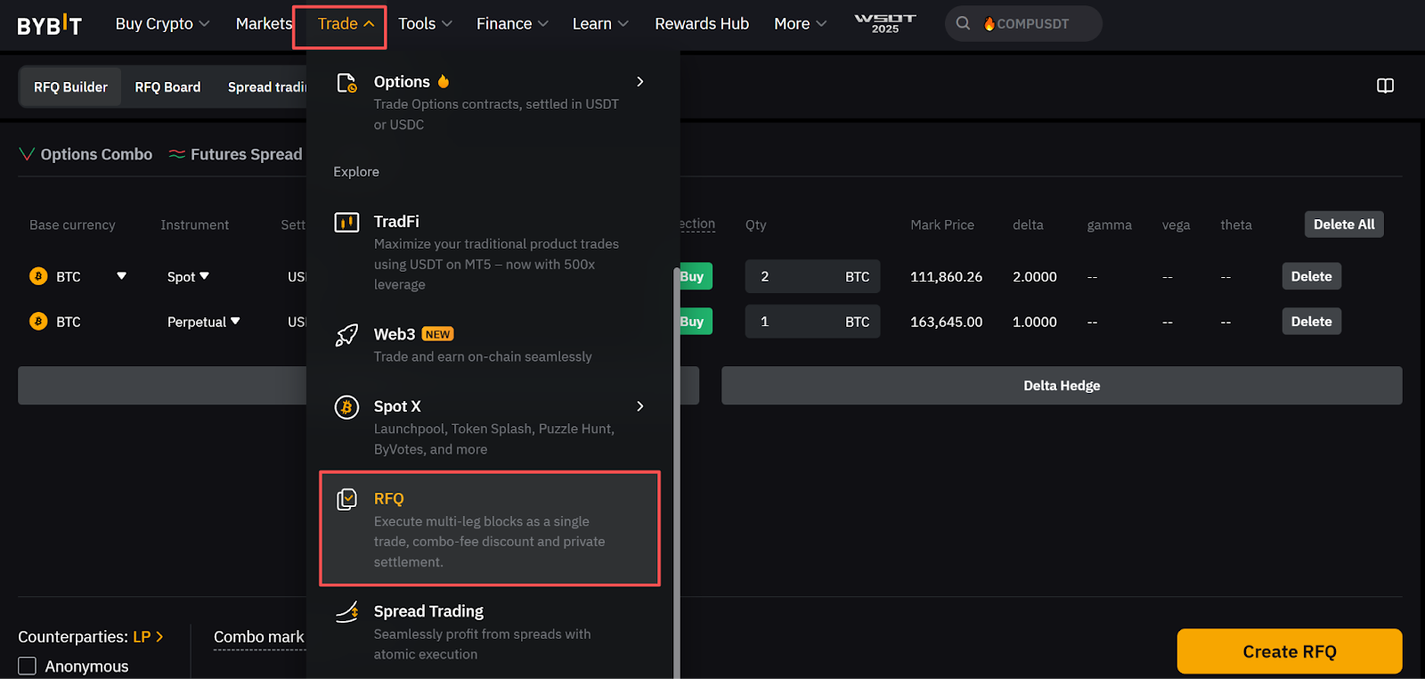 Step 1: Log in to the Bybit website and click Trade → RFQ in the navigation bar to go to the RFQ page.