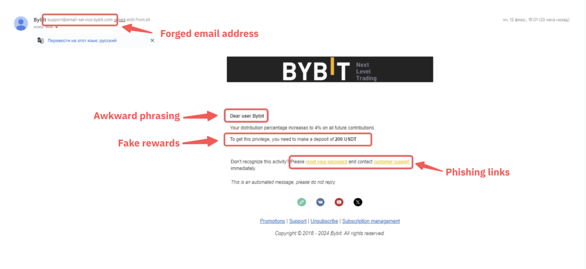 Verify the sender's contact information (e.g., email address, phone number, website URLs, etc.) against known legitimate Bybit official channels by looking for any inconsistencies or suspicious elements.