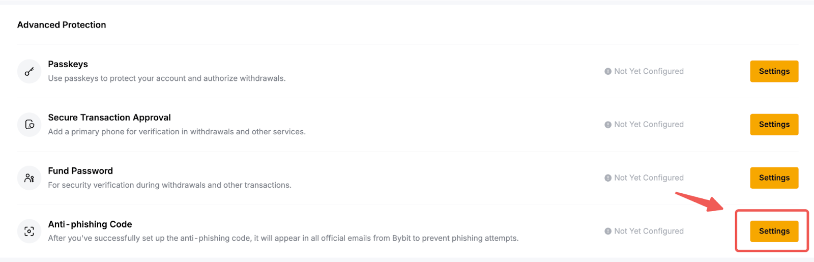 Bybit’s Anti-Phishing Code is a security feature comprising a unique set of alphanumeric and special characters. Once activated, this personalized code would appear in all official Bybit emails and text messages thereafter, allowing users to easily verify the authenticity of information they receive.
