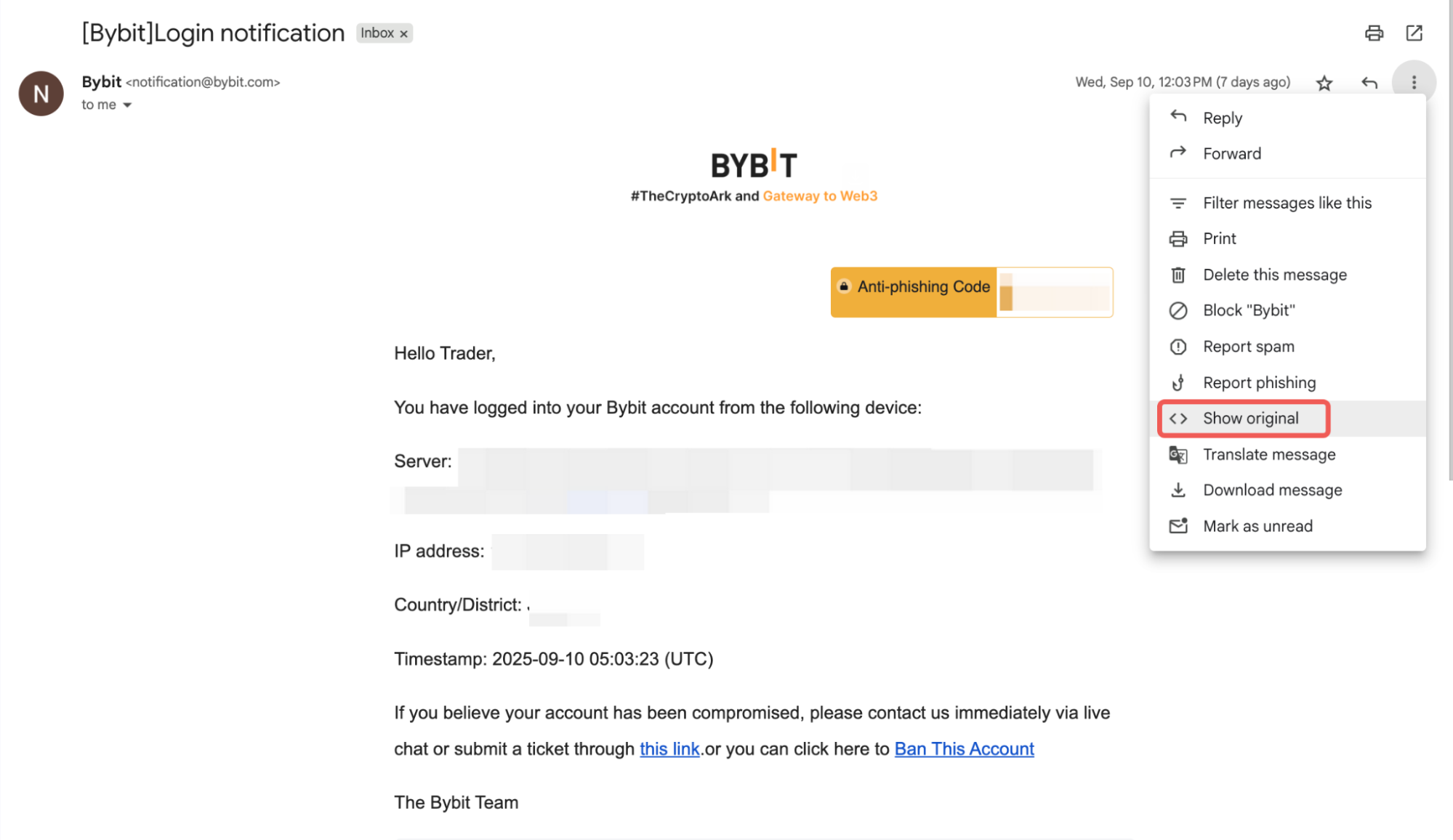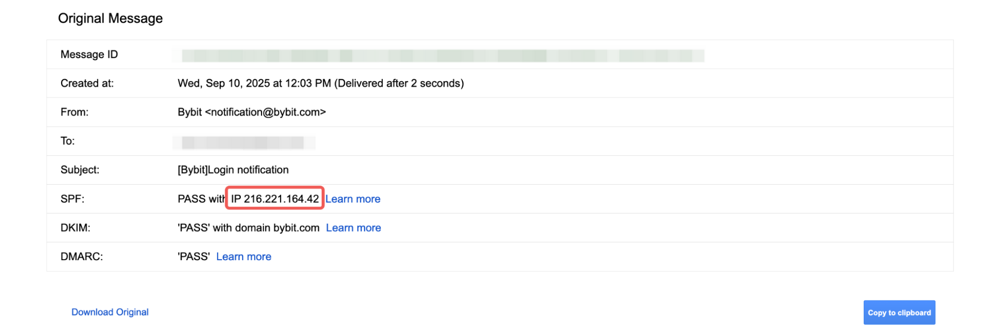 As mentioned above, even if the verification result is official, the sender’s contact information can be easily forged using spoofing techniques. Below is a typical example demonstrating how scammers conceal and forge sender email addresses to solicit assets from Bybit users.