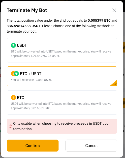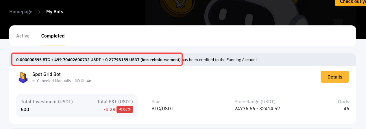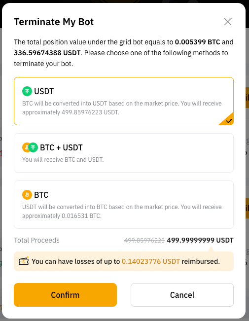 When you terminate your bot, the system will automatically use any available voucher to cover your losses. However, ensure that the coin type for bot settlement matches the voucher's designated coin type to utilize the Loss Cover Voucher.