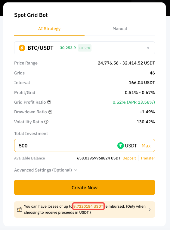 During the bot creation process, you'll be able to see the amount of your Loss Cover Voucher. Do note that the voucher only comes into effect upon the termination of the bot. Therefore, you will still need sufficient funds to operate your bot initially.