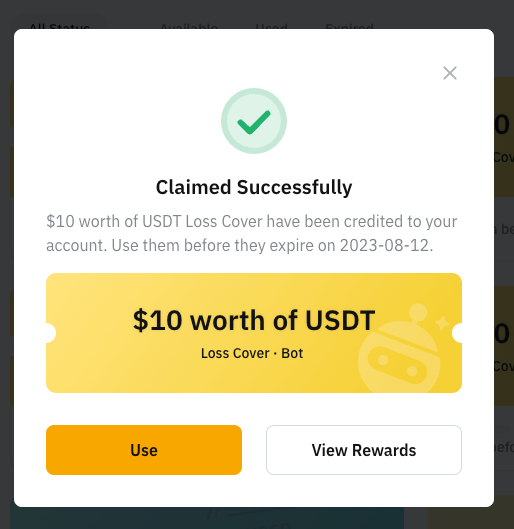 Once you have successfully claimed your voucher, you can click on View Rewards to review the details. If you wish to use it immediately, click on Use. This will redirect you to the Trading Bot page where you can create a bot.