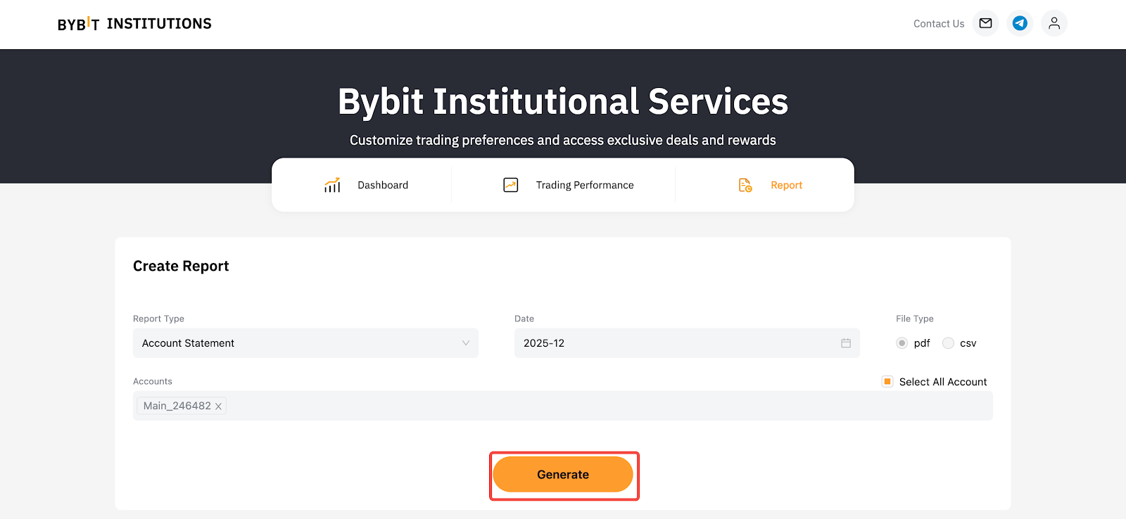 Step 1: Log into your Bybit Institutional Portal account, then click "Report".