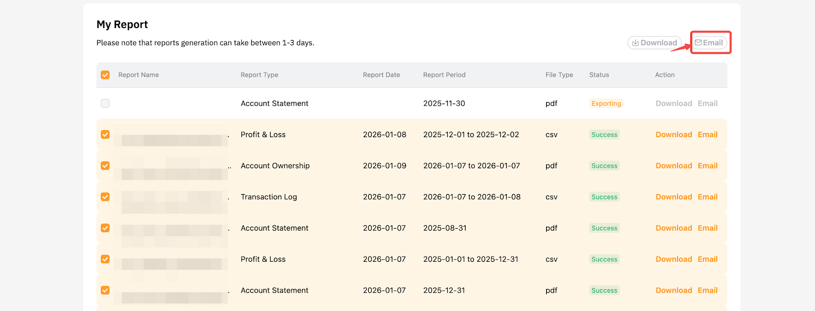 Alternatively, if you want to send your reports in a batch, you may multi-select the reports and click "Email" at the top to send selected reports.