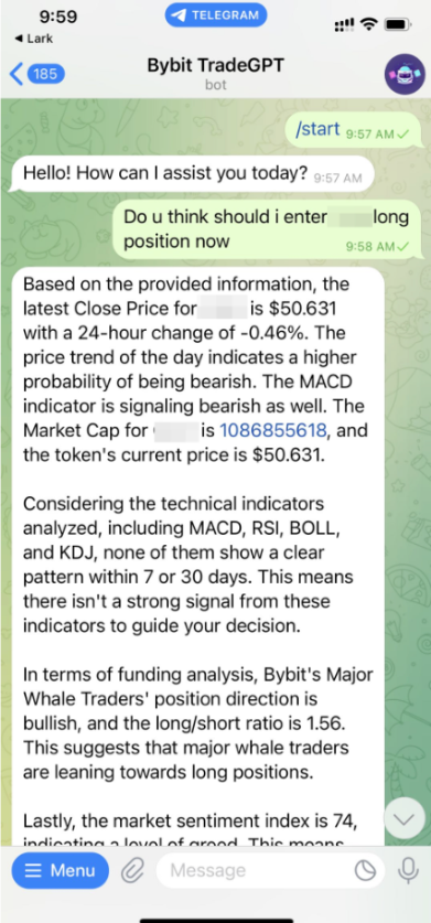 — Wherever you choose to engage — be it within a Telegram group, channel, or personal chat — the trading signals will be seamlessly delivered as personal messages directly from the Bybit TradeGPT Telegram Bot.