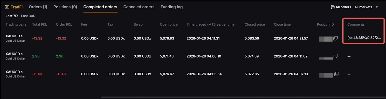 When the Margin Close-out is triggered on TradFi, it will be displayed in the following manner in the Completed Order tab.