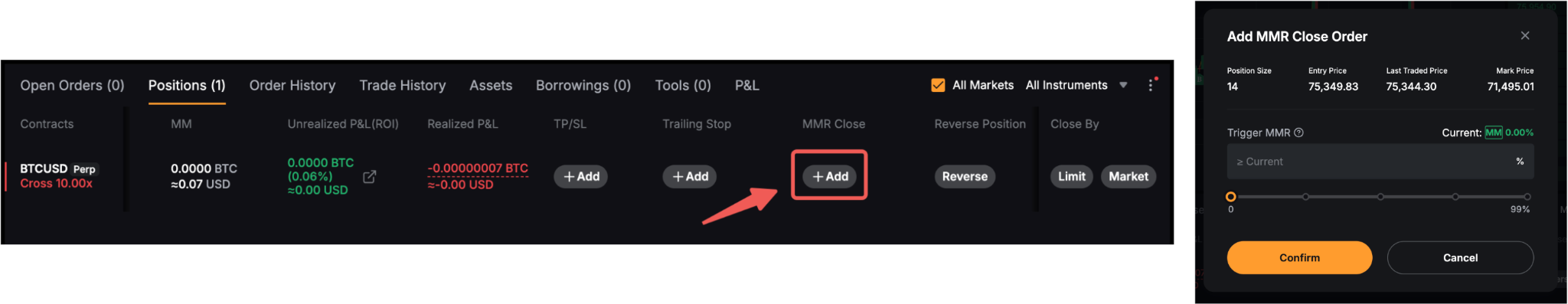 Click Add under MMR Close on your position tab. Then, set the Trigger MMR as desired.